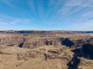 The dry cataracts at Potholes Coulee are another stunning feature not visible from the Ancient Lakes Trailhead but accessible by small aircraft. The trailhead is a popular starting point for exploring the coulee, with a rugged trail leading to the remnant cataracts that overlook the Columbia River. When the drone turned around and the dry falls came into view, I was awed by the cliffs towering over Babcock Bench. The photos tell a story of raging floods and giant waterfalls that have been silent for thousands of years.