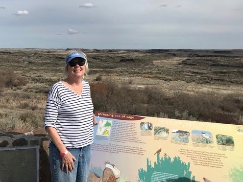 My husband and I attended the 2019 Sandhill Crane Festival in Othello, WA. We went because of my interest in seeing the ice age flood related features, but I also wanted to the the Sandhill Cranes – which we were told accumulate there by the hundreds of thousands. They are large, heron-like birds that like to fuel up in the fields on remnants of corn and alfalfa before heading north for the summer. We were warned to register for events as soon as possible, which we did. Nevertheless, the motels in Othello, a town of 7700, were full, so we stayed in Moses Lake, which is about 15 miles from Othello. The Festival used the high school gymnasium for exhibits and kid’s handicrafts and the classrooms for lectures and presentations. The events are obviously well attended because the parking lots were completely full. My husband was pleasantly surprised to be greeted by the mayor! I enjoyed seeing the familiar faces at the Ice Age Floods Institute exhibit. Our first tour, the evening we arrived, was out to the fields to see the cranes. We had a Fish and Wildlife biologist and an engineer from the Columbia Valley Irrigation Co. Apparently the cranes winter in Central Valley, Calif. and summer in Bristol Bay. They tend to be “right wing” (pun intended). As promised, they were present in the fields in the several thousands. Fortunately, our guides know which fields and sections line roads to take. The cranes make a unique noise, very distinguishable from the honking of geese. There were also hundreds of thousands of snow geese circling like clouds overhead. Unfortunately, the Pothole Lakes were still frozen. The irrigation engineer provided interesting input with regard to the value of the irrigation system, i.e. water provided by the Grand Coulee Dam and a sandy loam soil provided by the ice age floods, The area was obviously rich agriculturally. Our Saturday field trip was with Brent Cunderla, former BLM geologist. He took us through portions of the channeled scab land formations and provided a good overview of the flood story. We listened to his talk prior to the field trip – which provided background on what we were to see. Our Sunday field trip was a hike through the Drumheller channels with Bruce Bjornstad, also a geologist and author of several papers and books on the Ice Age Floods. Drumheller is a state park that includes buttes and cliffs on the columnar basalts. Although I was focused on scab-land geology, the festival had speakers and field trips by many biologists, regional geologists, and and naturalists. If I were to do this again, and I’m tempted, I would attend some of these. All in all, it was a lot of fun. by Lynne Dickman