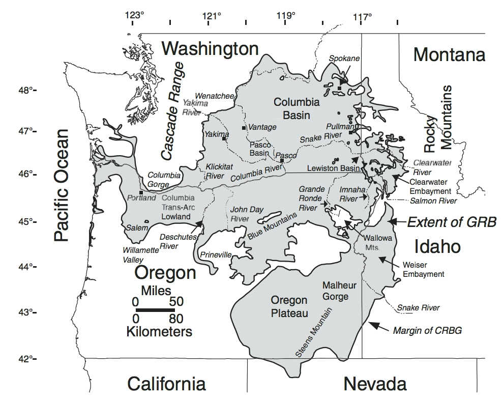 The Bowl and Pitcher is a rock formation along the Spokane River and one of the most scenic sites in the area, with basalt cliffs rising 500 feet above the river and large blocks of basalt in the river causing large rapids. The “Bowl” is a circular depression in the river and the “Pitcher” is a large detached block of highly fractured basalt. The geology of Spokane’s Bowl and Picher features dramatic basalt cliffs carved out of the flows from the Columbia River Basalt Group (CRBG), which reached this area 16 million years ago. There are river and flood deposits of sand and gravel, with granitic boulders forming terraces on the east side of the river, and huge blocks of basalt, causing the Dragon Tooth rapids, downriver from the Bowl and Pitcher. How did those rocks get there? The Spokane and Columbia rivers occupy a long, mostly bedrock canyon near the northeastern boundary of the Columbia Plateau. Glacial Lake Columbia, which formed behind the Okanogan ice lobe, occupied all of the Spokane River and a portion of the Columbia drainage basin during the last Ice Age. Then the glacial Lake Missoula outburst floods first surged over the Columbia Basin beginning around 17,000 years ago, ripping away the CRBG and other bedrock from Bayview, Idaho, to the Pacific Ocean. These floods also deposited a thick sequence of flood gravel in the valley. As Lake Columbia water level dropped, the Spokane River began to remove the sand and gravel fill. Subsequent floods continued to remove the flood deposits, leaving the basalt benches on the west side of the river and the terraces on the east side. Riverside State Park is located northwest of Spokane and consists of over 9000 acres along the Spokane and Little Spokane Rivers. The park is the second largest state park and has many recreational activities including, camping, hiking, mountain biking, horseback riding and boating (Discover Pass required). There are two view points for the Bowl and Pitcher. The first is from a small parking lot off the entrance road from Aubry White Parkway that provides an elevated view of the site. The main parking area is down along the river with a picnic area and a network of trails. From the parking lot you can follow the wheelchair accessible path across the suspension bridge over the Spokane River. From the bridge you can enjoy a view of the features that give the site its name. The original bridge was built in 1942 by the Civilian Conservation Corps. The existing bridge, based on the same plans, opened in 1998. On the west side of the river, you can access a network of trails along the river or climb up along the bluffs above the river.
