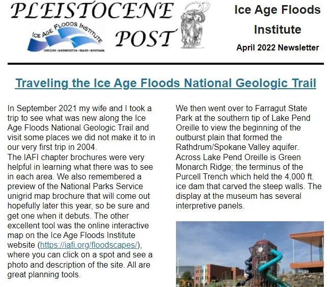 Ice Age Floods Fourth Grade Curriculum Development One of the missions of the Ice Age Floods Institute is to educate young people about the Floods and the influence of the Floods on their lives today. The IAFI Educational Outreach Committee has contracted with the curriculum design firm The Inspired Classroom to produce engaging lesson materials to excite fourth-grade students from across the Northwest about the Ice Age Floods. The curriculum will contain video footage narrated by experts and lesson plans for use by fourth grade teachers in Montana, Idaho, Washington and Oregon. The story, entitled “Scholars Trek on the Ice Age Floods Trail,” will begin with a flyover video of the trail, including Glacial Lake Missoula, the Clark Fork Ice Dam, the Rathdrum Prairie, Spokane Falls, the Channeled Scabland, Lake Lewis, the Columbia River Gorge, Lake Allison, and the deposition of the eroded sediment on the continental shelf at the mouth of the Columbia River. Along the route, students will be introduced to the ways in which the Floods influence society today, including the influence of the Floods on the Spokane Aquifer and on railroad and highway routes across the Pacific Northwest. Funding for the project will come from grants, the IAFI, and from private benefactors. The continued support of IAFI members through membership dues and donations helps fund projects like this. The Education Committee is made up from a sampling of IAFI Board Members and Chapter Presidents from each state: Jim Shelden (Glacial Lake Missoula); Tony Lewis (Coeur du Deluge); Melanie Bell and Consuelo Larrabee (Cheney-Spokane); Gary Kleinknect (Lake Lewis) and Dale Lehman (Puget Lobe.) In the future, the Education Committee plans to work on curriculum materials for middle and high school students. By Dale Lehman, 04/14/2022