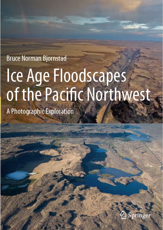 Bruce Bjornstad has a new book, “Ice Age Floodscapes of the Pacific Northwest“, just released by publisher Springer. This heavily illustrated book contains descriptions and geologic interpretations of photographs (mostly aerial) illustrating the power and magnitude of repeated Ice Age flooding in the Pacific Northwest, as recently as 14,000 years ago. The scale of the Ice Age floods was so huge that today it is often difficult to see the evidence from ground level. However, from the air, landforms created by the floods often come into clear focus. Aerial images, obtained via unmanned aerial vehicle (drone) as well as fixed-wing airplane, add a new perspective on these Earth-changing events gathered by dozens of scientists since 1923.