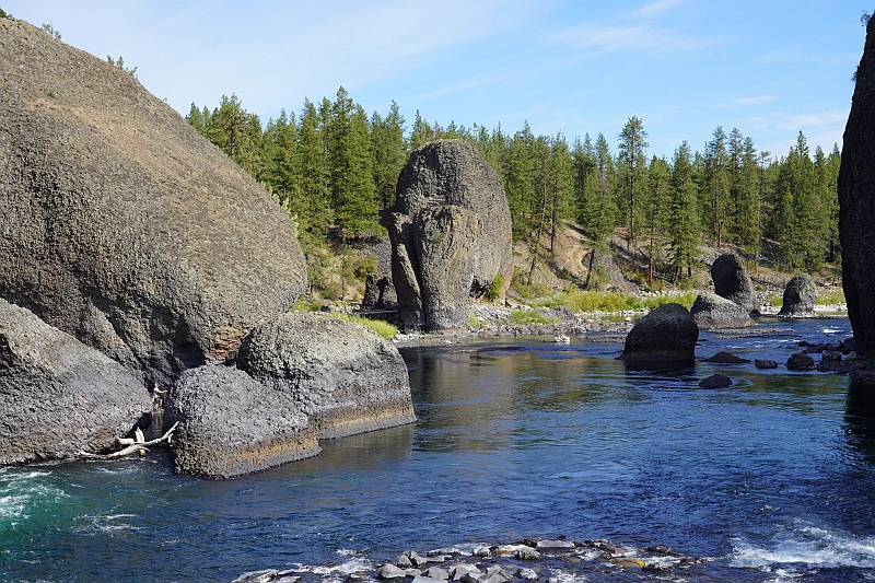 The Bowl and Pitcher is a rock formation along the Spokane River and one of the most scenic sites in the area, with basalt cliffs rising 500 feet above the river and large blocks of basalt in the river causing large rapids. The “Bowl” is a circular depression in the river and the “Pitcher” is a large detached block of highly fractured basalt. The geology of Spokane’s Bowl and Picher features dramatic basalt cliffs carved out of the flows from the Columbia River Basalt Group (CRBG), which reached this area 16 million years ago. There are river and flood deposits of sand and gravel, with granitic boulders forming terraces on the east side of the river, and huge blocks of basalt, causing the Dragon Tooth rapids, downriver from the Bowl and Pitcher. How did those rocks get there? The Spokane and Columbia rivers occupy a long, mostly bedrock canyon near the northeastern boundary of the Columbia Plateau. Glacial Lake Columbia, which formed behind the Okanogan ice lobe, occupied all of the Spokane River and a portion of the Columbia drainage basin during the last Ice Age. Then the glacial Lake Missoula outburst floods first surged over the Columbia Basin beginning around 17,000 years ago, ripping away the CRBG and other bedrock from Bayview, Idaho, to the Pacific Ocean. These floods also deposited a thick sequence of flood gravel in the valley. As Lake Columbia water level dropped, the Spokane River began to remove the sand and gravel fill. Subsequent floods continued to remove the flood deposits, leaving the basalt benches on the west side of the river and the terraces on the east side. Riverside State Park is located northwest of Spokane and consists of over 9000 acres along the Spokane and Little Spokane Rivers. The park is the second largest state park and has many recreational activities including, camping, hiking, mountain biking, horseback riding and boating (Discover Pass required). There are two view points for the Bowl and Pitcher. The first is from a small parking lot off the entrance road from Aubry White Parkway that provides an elevated view of the site. The main parking area is down along the river with a picnic area and a network of trails. From the parking lot you can follow the wheelchair accessible path across the suspension bridge over the Spokane River. From the bridge you can enjoy a view of the features that give the site its name. The original bridge was built in 1942 by the Civilian Conservation Corps. The existing bridge, based on the same plans, opened in 1998. On the west side of the river, you can access a network of trails along the river or climb up along the bluffs above the river.