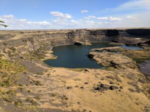 As the water poured over the edge of the precipice, it created massive “plunge pools” at the base, some 400 feet below, which are now filled with the deep, blue lakes you see in the distance. Yet the surface of the flood waters showed barely a crease. The roiling force of the mud-saturated water ripped basalt bedrock off the face of the falls, layers of lava that had cooled millions of years prior. This process had caused the precipice that had begun miles downstream to retreat, migrating upstream to create the massive, crescent-shaped vertical walled amphitheater that spreads out before you.