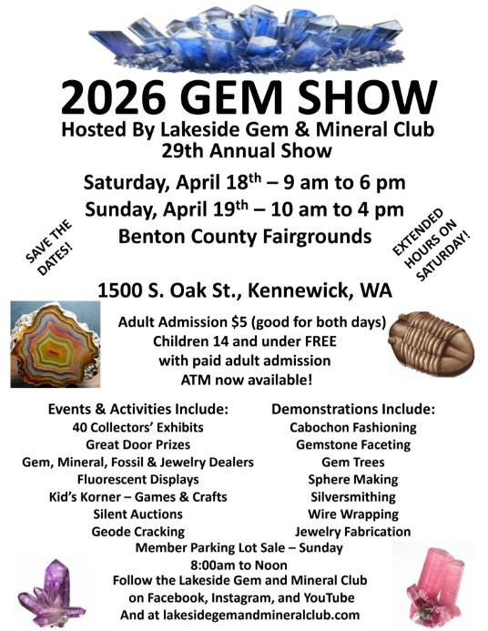 It’s less than a month away! The members of the Lakeside Gem & Mineral Club invite all to our 29th Annual Gem and Mineral show April 18-19. Join us at the Benton County Fairgrounds Building #2 in Kennewick.
