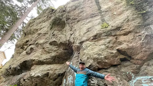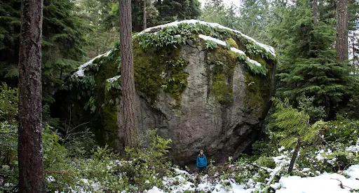 One of the giant erratics of Western Washington hides in the forest in Saratoga Woods Park on Whidbey Island. The Waterman erratic is 38ft high and has a circumference of 135 ft. Analysis of the rock shows that it is composed of Greenschist, a rock containing the low grade metamorphic minerals Chlorite and Epidote. The Greenschist chemically matches the rock of Mt. Erie, a prominent Roche Moutonée found 40 miles to the north on Fidalgo Island.