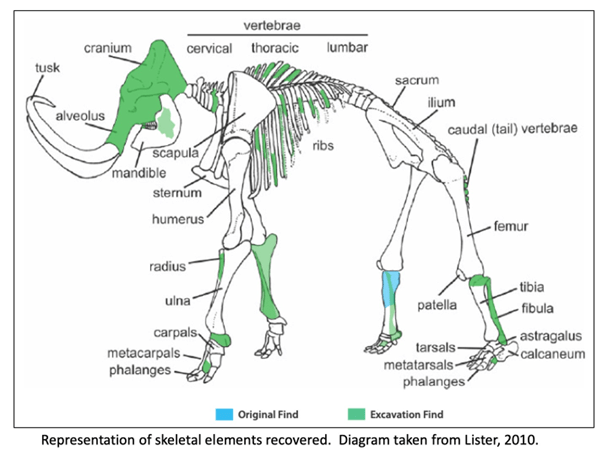 Mammoth remains are not that uncommon in Washington with several hundred animals discovered in the state, though fewer than 100 of those discoveries are located in eastern Washington. What is significant about this mammoth site is that it is one of the few finds that has received this much intensive study. Over 130 bones and bone fragments from a single Columbia mammoth were recovered with about 69 specimens identified. The animal was estimated to be between 25-30 years of age based on characteristics of its dentition, and it even lived with a damaged rib which had healed.